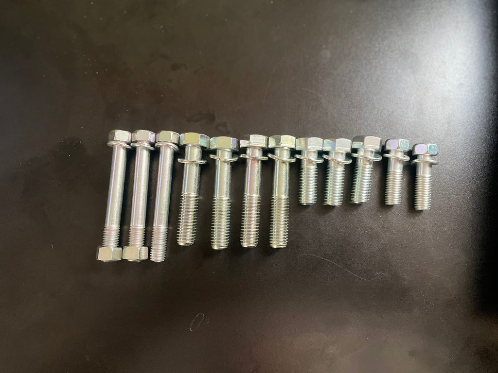 complete set of bell housing bolts for all TD42 engines. Bottom bolts are longer to suit GQ gearbox, for GU gearbox extra washers or spacer may be required for clearance